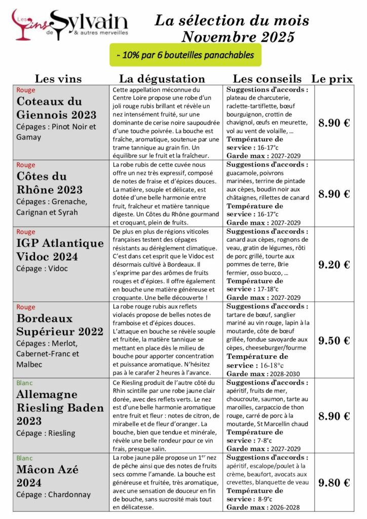Ces vins vous seront proposés accompagnés d’une fiche de dégustation mentionnant notamment les accords mets et possibles. De plus, vous bénéficierez d’une remise de 10% à partir de 6 bouteilles achetées dans la sélection des vins du mois (panachage des vins possible)