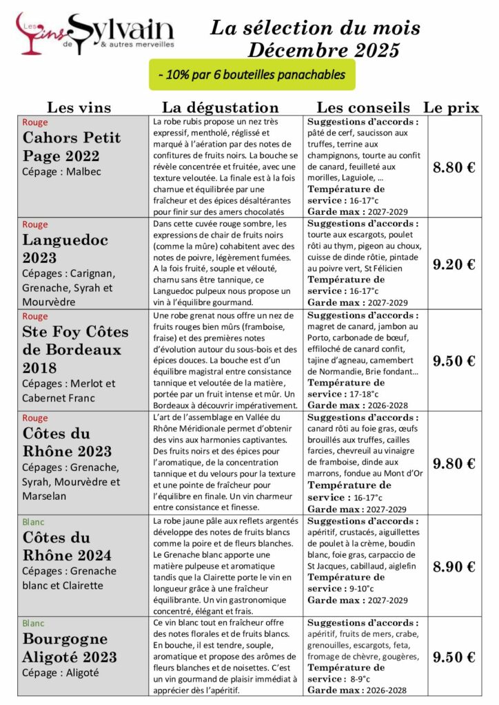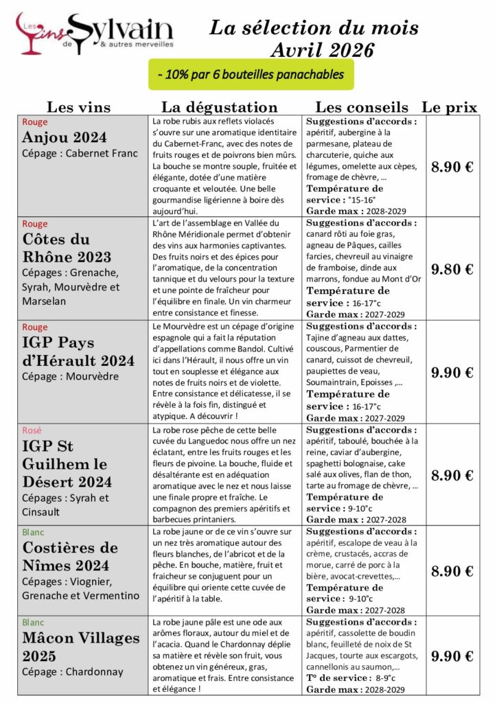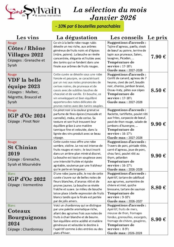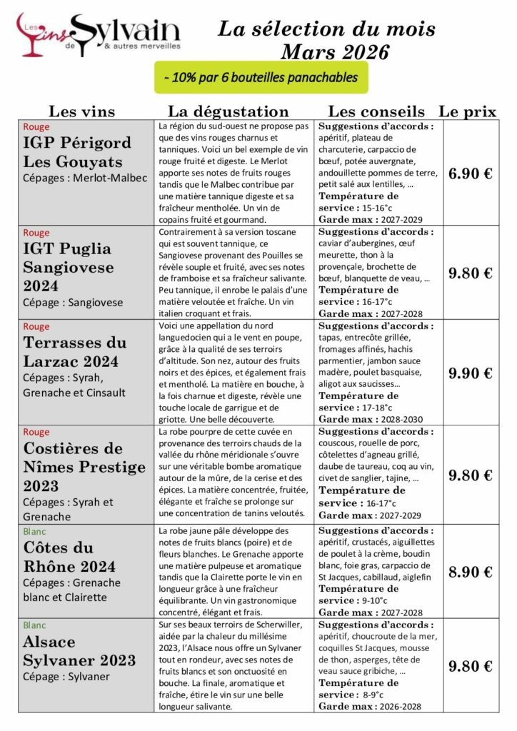 TOUS LES MOIS, LES VINS DE SYLVAIN VOUS PROPOSE UNE SÉLECTION DE 6 VINS SOIGNEUSEMENT SÉLECTIONNÉS POUR RÉPONDRE AUX CRITÈRES SUIVANTS :